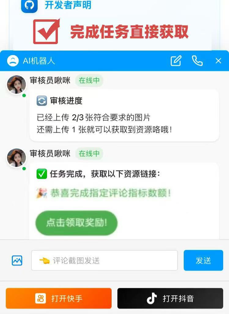 将发送的所有评论截图发给右下侧的 AI机器人 机器人会在(10)秒内审核完,然后会在聊天框自动弹出所有资源的跳转网盘链接注意:不规范截图和上传重复截图将重置进度!已完成示例:👇👇👇